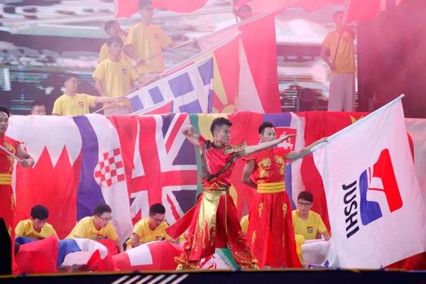 巨石產(chǎn)品遠(yuǎn)銷全球,巨石旗和數(shù)十面國(guó)旗在舞臺(tái)上縱情揮舞,五彩飄揚(yáng)的旗幟展現(xiàn)出巨石人勇敢走出去、堅(jiān)定走下去、健康走回來的自信與豪邁。