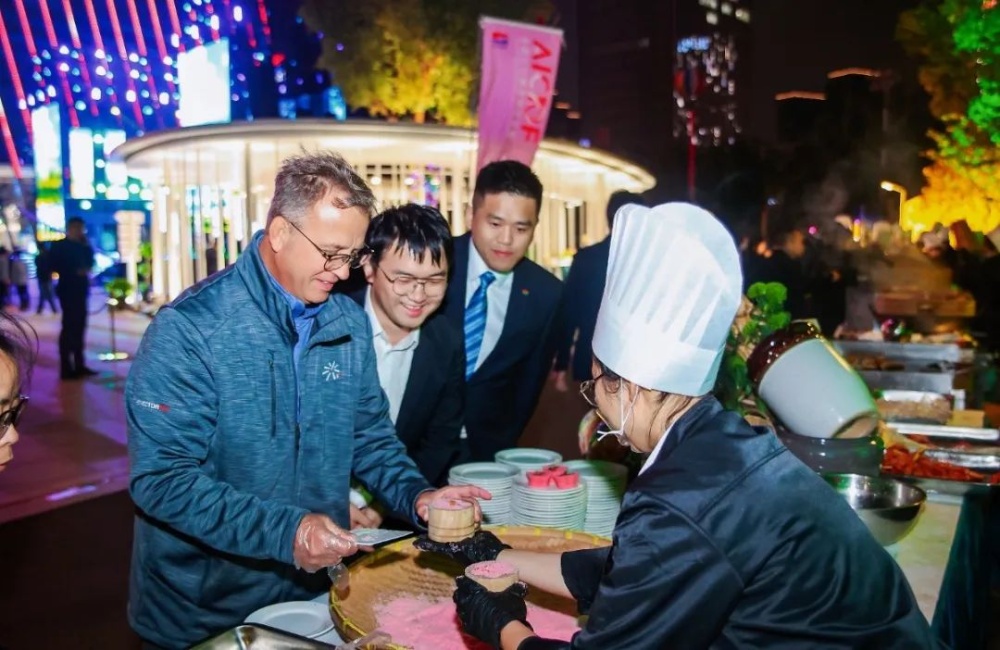 民俗互動體驗(yàn)區(qū)圍滿了國外嘉賓,體驗(yàn)了一番桐鄉(xiāng)特色打年糕和制作定勝糕。美國維克托派公司首席執(zhí)行官Trevor Humphrey在品嘗完親手制作的定勝糕后,豎起大拇指夸贊,賓客們詢問食物名稱,“WinWin!”糕點(diǎn)師的回答讓賓主盡歡。