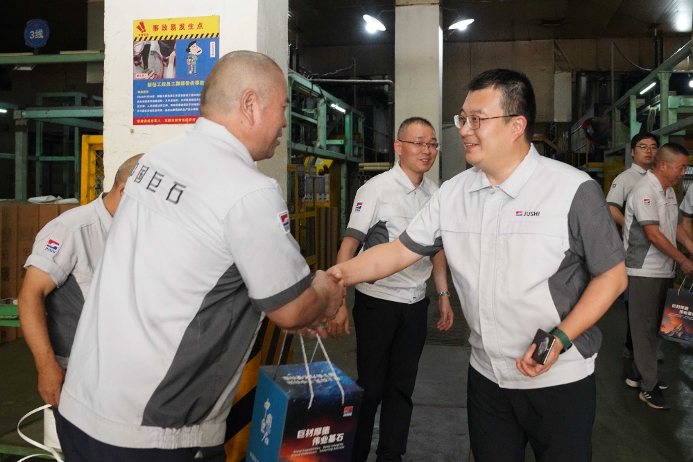 7月16日,中國(guó)巨石黨委書(shū)記、總裁楊國(guó)明帶隊(duì)慰問(wèn)高溫崗位員工,為他們送“清涼”。