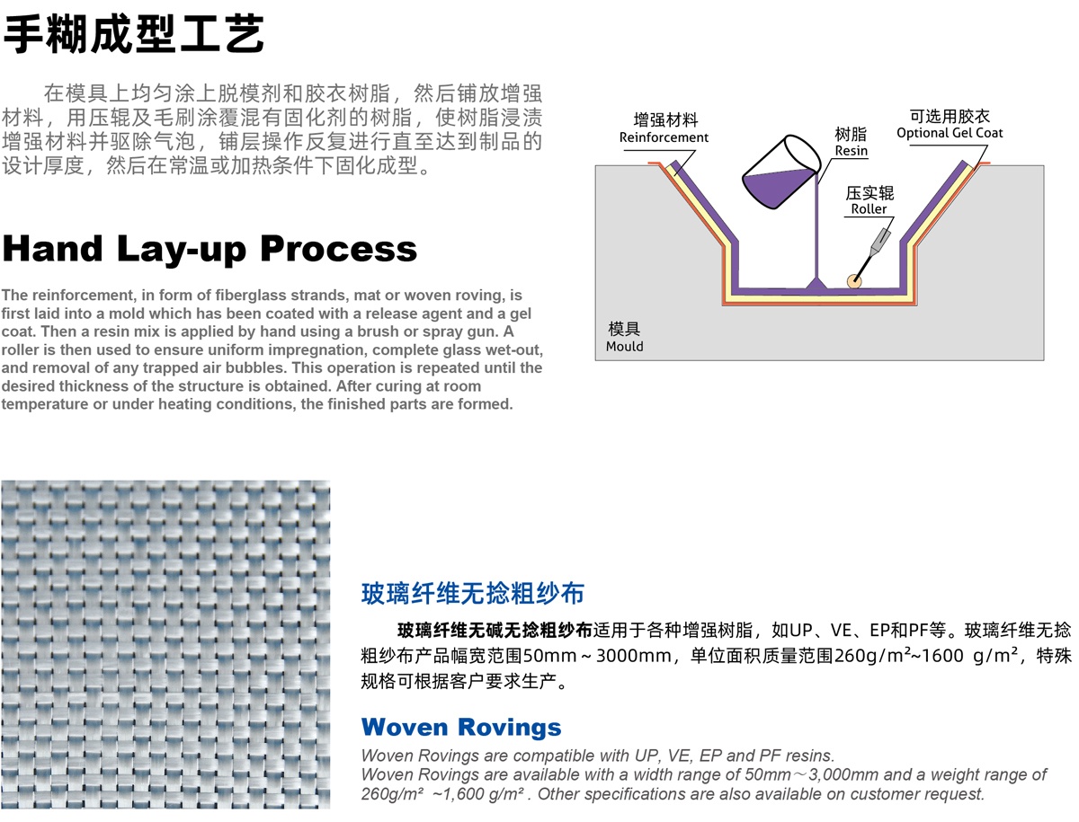 | P02 | 拉伸強(qiáng)度高,適用于手糊工藝生產(chǎn)面積較大的制品,樹脂浸穿性好, 浸透速度快,氣泡氣容易排除,制品機(jī)械強(qiáng)度高,優(yōu)異的耐酸腐蝕性能 High tensile strength, suitable for use in hand lay-up process to produce large-area parts, good wet-through and fast wet-out in resins, rapid air lease, high mechanical strength | |