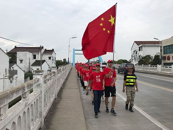 當(dāng)天雖然秋風(fēng)瑟瑟,但長(zhǎng)時(shí)間的徒步仍然讓大家汗流不止,可是不管多累,他們都不曾放慢腳步。領(lǐng)隊(duì)更是始終高舉著五星紅旗,昂首闊步走在最前列,成為所有人的方向標(biāo)。行至一半左右,天空下起了小雨,秋雨夾雜著秋風(fēng)滴打在人們的臉上。。來(lái)自成都公司的魏冬表示,即使路上碰到了刮風(fēng)下雨,他們也絕不妥協(xié),堅(jiān)持一步一步堅(jiān)定的走下去。