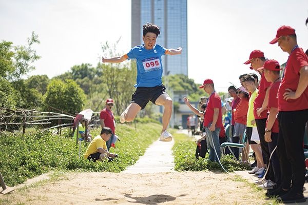 賽場(chǎng)上,100米預(yù)賽的飛人們?cè)谂艿郎虾魢[而過(guò)的身影引得現(xiàn)場(chǎng)發(fā)出一陣陣歡呼與尖叫,實(shí)力相近的選手在沖線(xiàn)的那一刻更是讓觀眾無(wú)法用肉眼判斷誰(shuí)先誰(shuí)后。當(dāng)觀眾們還未從百米飛人大戰(zhàn)的余韻中跳脫出來(lái)的時(shí)候,跳遠(yuǎn)的比賽掀起了當(dāng)天的高潮。3米、4米、5米,選手們一次次刷新著記錄,起身飛躍、黃沙飛揚(yáng),來(lái)自四分廠的蔣家鳴以5.66米的成績(jī)打破了跳遠(yuǎn)的記錄,也引得現(xiàn)場(chǎng)無(wú)數(shù)的歡呼。