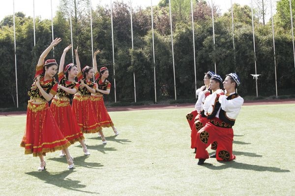 珠纓旋轉(zhuǎn)星宿搖,花蔓振作龍蛇動。綠茵場上,姑娘們隨著動感的節(jié)奏舞動身姿,時而化身成達(dá)坂城的姑娘翩翩起舞,時而化身青春洋溢的正能量少女,旋轉(zhuǎn)、跳躍。下午的陽光照射在姑娘們的身上,熱情與汗水肆意揮灑,練習(xí)多日的舞蹈在這一天盡情展現(xiàn)。