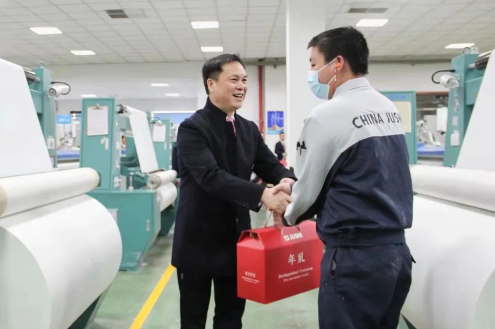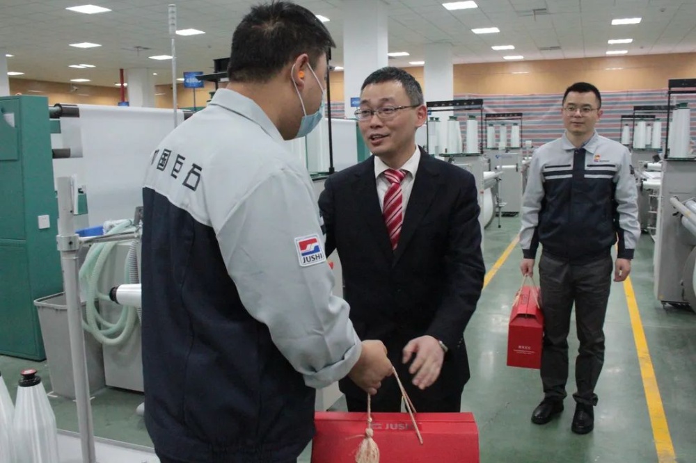 在六分廠,張毓強每到一處,都走進員工們的工作崗位詢問工作、生活情況。拉絲工龔成康來巨石工作7個月了,他說,現(xiàn)在的工作環(huán)境好,待遇好,讓他覺得很滿意。當?shù)弥依镉腥齻€兄弟,21歲的他是老二,弟弟還在上大學,張毓強鼓勵他好好工作,為家里多分擔。四川籍老員工蔡文田是一名一線班組長,來巨石工作14年了,已經(jīng)在桐鄉(xiāng)買房定居??吹焦绢I導來慰問,作為退伍軍人的他莊重地敬了一個軍禮,“張總新年好!現(xiàn)在公司發(fā)展好了,讓我們員工更有奔頭了?!睆堌箯姖M臉笑容,親切地與他握手,感謝他這么多年的辛勤付出!